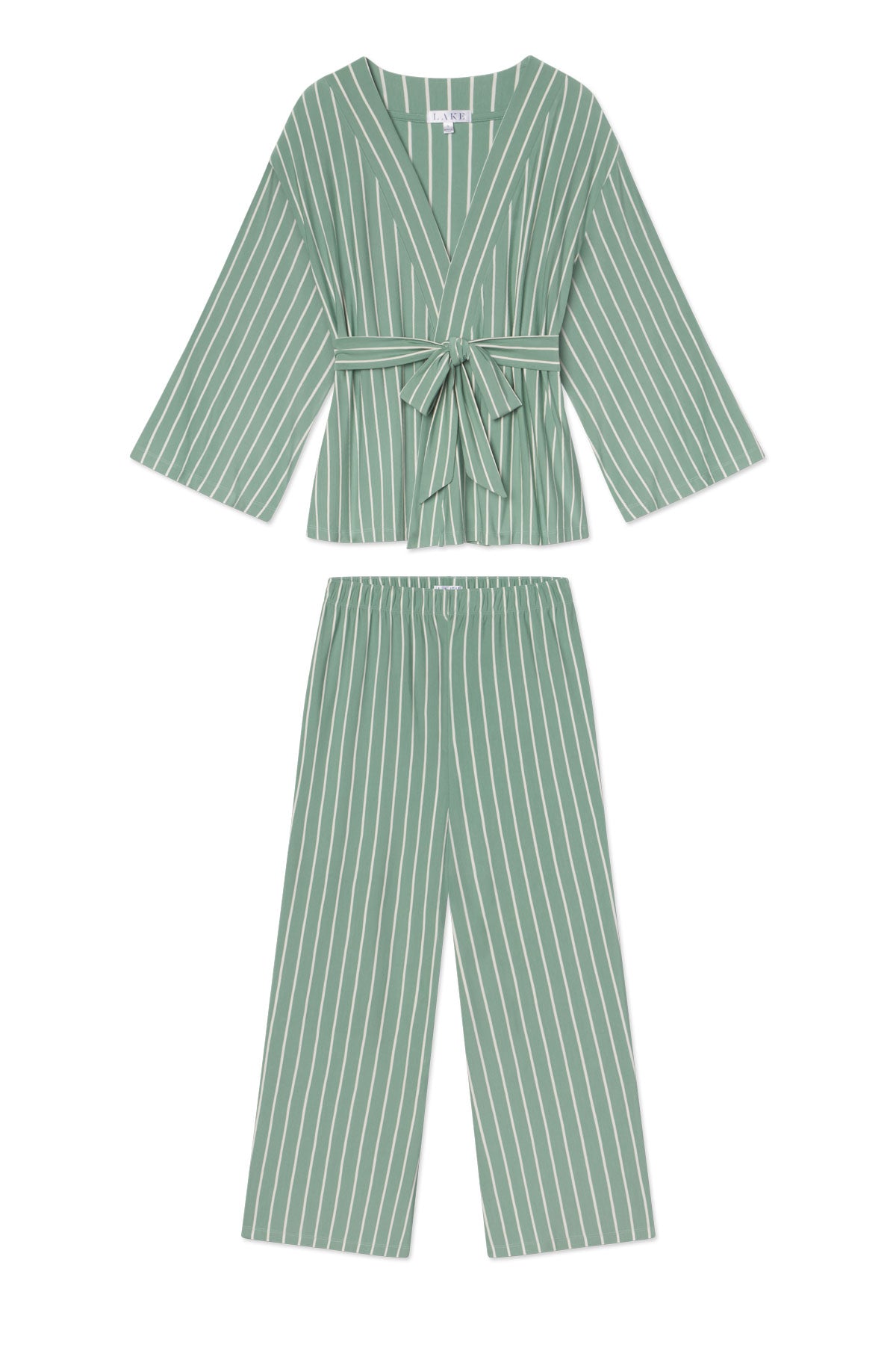 The DreamModal™ Kimono Pajama Set in Boxwood Vertical Stripe. a soft. cool green with white stripes. features a wrap top with wide. bell sleeves and full-length pants with a wide leg and elastic waistband. The wrap silhouette and generous proportions are also nursing-friendly for moms and moms-to-be. Made of 95% modal. 5% spandex.