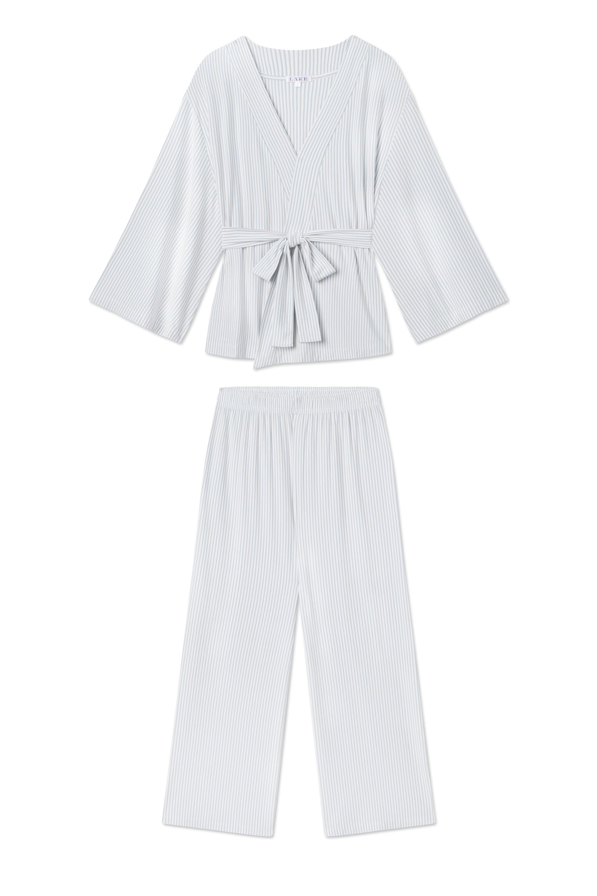 The DreamModal™ Kimono Pajama Set in Fog. a calming blue-grey stripe. features a wrap top with wide. bell sleeves and full-length pants with a wide leg and elastic waistband. The wrap silhouette and generous proportions are also nursing-friendly for moms and moms-to-be. Made of 95% modal. 5% spandex.
