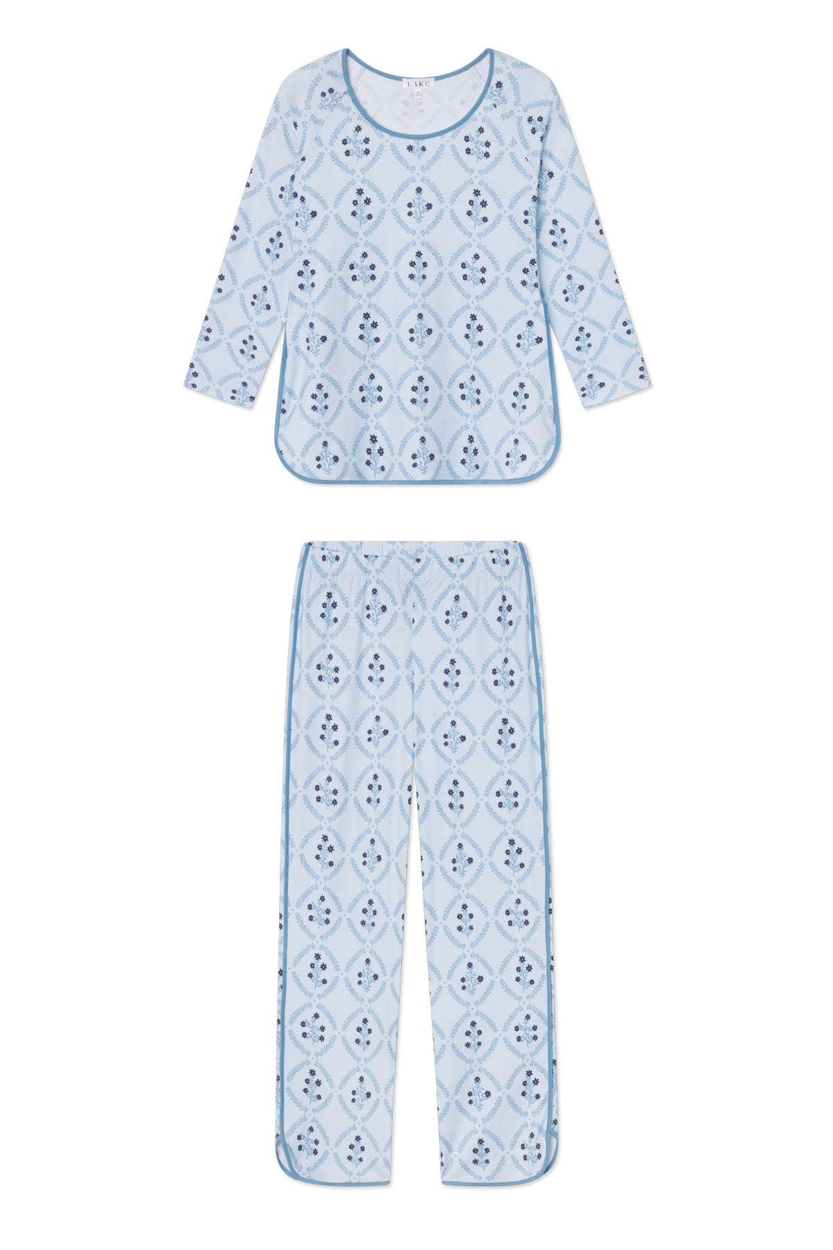 The Pima Long-Long Set in Serene Blue Wreath. inspired by boxwood wreaths in shades of blue. features a three-quarter sleeve scoop neck top and pants with an elastic waistband. Made from 100% Pima Cotton.